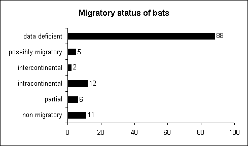 Fig. 4.4: Migratory status of 124 bat species listed by the GROMS. Non-migratory bats are included because they are listed on CMS Appendix II and covered by the EUROBATS agreement. Note the high number of species for which a reliable assessment was impossible. |
